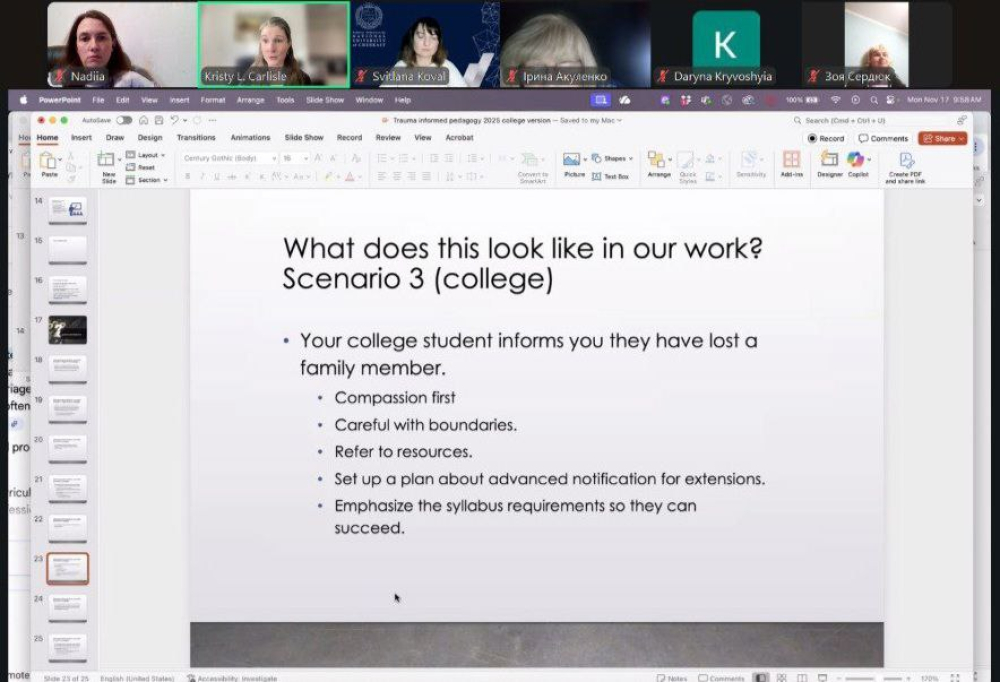 У межах лекції д-р Крісті Л. Карлайл (Університет Олд Домініон) представила практичні ситуації з педагогічної діяльності. Один із розглянутих прикладів стосувався того, як правильно реагувати, коли студент повідомляє про втрату члена родини. Серед ключових рекомендацій — починати зі співчуття, дотримуватися здорових професійних меж, спрямовувати до відповідних ресурсів, завчасно узгоджувати можливість продовження термінів виконання завдань та вцілому підтримувати студента.